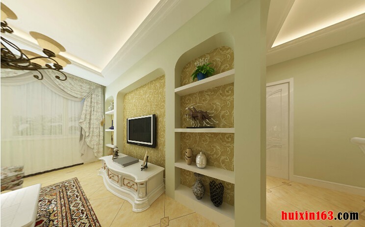 客厅的布置非常的简洁清新,顶面上的吊顶结构呈现出一个非常简单的长方形,环绕着一圈明亮的灯带,中央的位置是一盏铜色复古吊灯,在墙面上设计了三个连续的拱门结构,在拱门里面张贴了浅黄色的欧式花纹的墙纸,营造出对称优雅的美丽。 在中央摆放一个电视柜充当电视背景墙,两边的拱门上安装上隔板,就是很好的展示架。