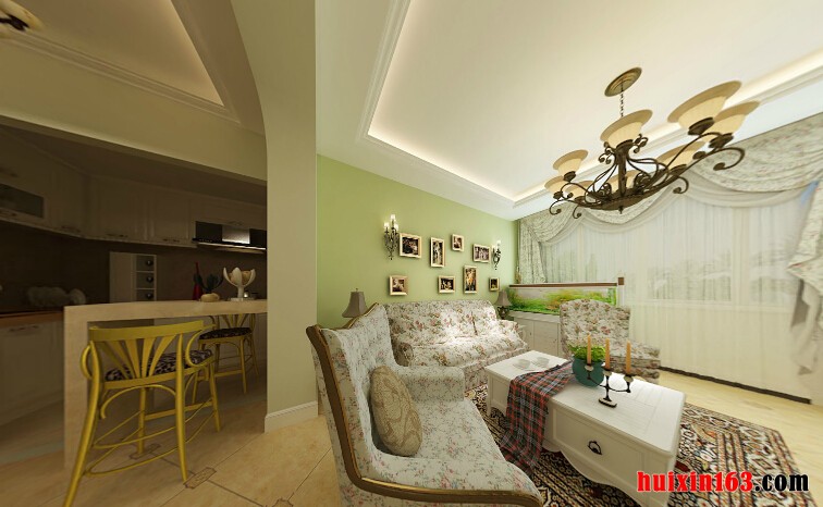 客厅的布置非常的简洁清新,顶面上的吊顶结构呈现出一个非常简单的长方形,环绕着一圈明亮的灯带,中央的位置是一盏铜色复古吊灯,在墙面上设计了三个连续的拱门结构,在拱门里面张贴了浅黄色的欧式花纹的墙纸,营造出对称优雅的美丽。 在中央摆放一个电视柜充当电视背景墙,两边的拱门上安装上隔板,就是很好的展示架。