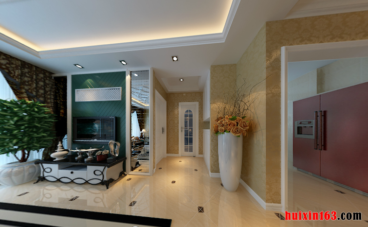 在比较宽大的客厅和餐厅里面采用一些欧式的浅黄色花纹的墙纸和绿色背景的墙面漆作为装饰,打造出非常优雅大气感觉。在餐厅的顶面上设计出一个突出的长方形,边缘围绕着一去昂明亮的灯带,中央四个角设计了射灯,中央的一盏金黄色的吊灯,打造出华美的视觉效果。在墙面拐角的位置摆放了一个白色的大花瓶,里面插上鲜黄色的花朵,为空间增添了一抹亮色。