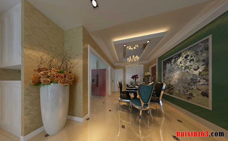 在比较宽大的客厅和餐厅里面采用一些欧式的浅黄色花纹的墙纸和绿色背景的墙面漆作为装饰,打造出非常优雅大气感觉。在餐厅的顶面上设计出一个突出的长方形,边缘围绕着一去昂明亮的灯带,中央四个角设计了射灯,中央的一盏金黄色的吊灯,打造出华美的视觉效果。在墙面拐角的位置摆放了一个白色的大花瓶,里面插上鲜黄色的花朵,为空间增添了一抹亮色。