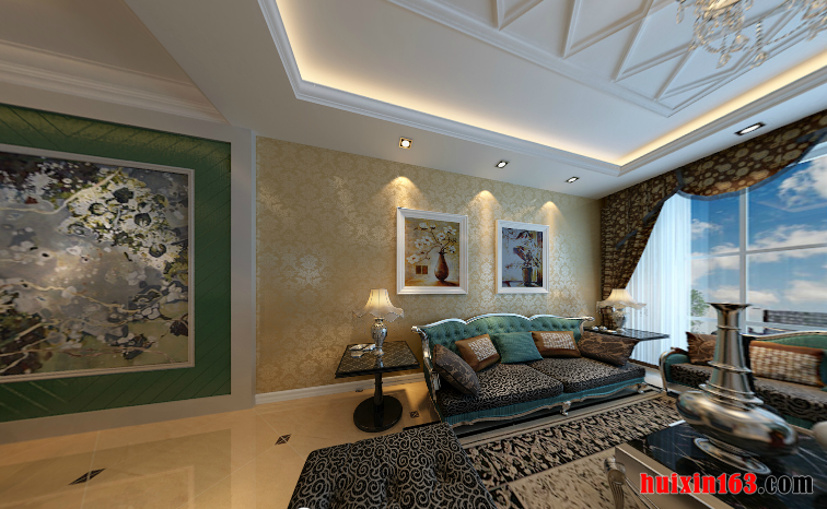在比较宽大的客厅和餐厅里面采用一些欧式的浅黄色花纹的墙纸和绿色背景的墙面漆作为装饰,打造出非常优雅大气感觉。在餐厅的顶面上设计出一个突出的长方形,边缘围绕着一去昂明亮的灯带,中央四个角设计了射灯,中央的一盏金黄色的吊灯,打造出华美的视觉效果。在墙面拐角的位置摆放了一个白色的大花瓶,里面插上鲜黄色的花朵,为空间增添了一抹亮色。