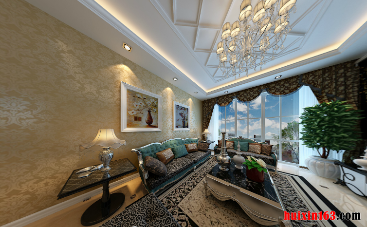 在比较宽大的客厅和餐厅里面采用一些欧式的浅黄色花纹的墙纸和绿色背景的墙面漆作为装饰,打造出非常优雅大气感觉。在餐厅的顶面上设计出一个突出的长方形,边缘围绕着一去昂明亮的灯带,中央四个角设计了射灯,中央的一盏金黄色的吊灯,打造出华美的视觉效果。在墙面拐角的位置摆放了一个白色的大花瓶,里面插上鲜黄色的花朵,为空间增添了一抹亮色。