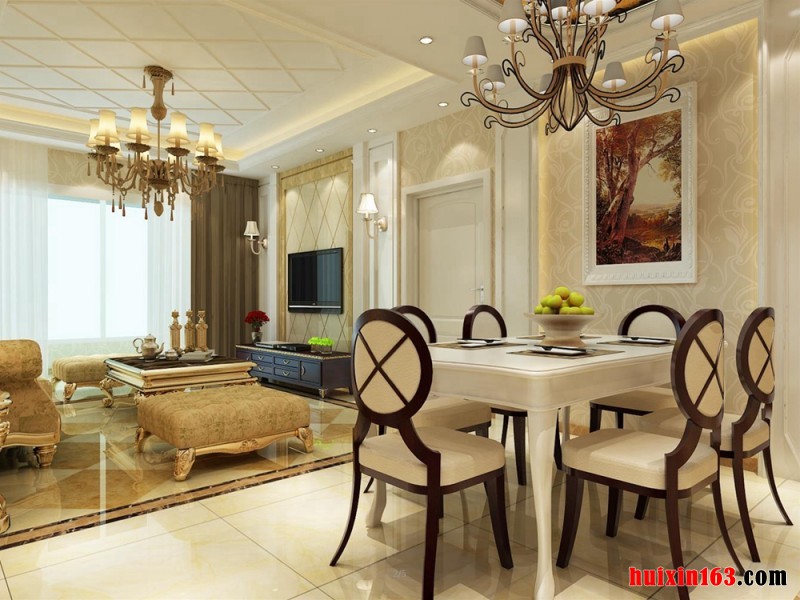 本案家居设计,在色彩的选择上,主要以暖色为主,凹位造型吊顶,菱形格子样式设计,增加了客厅的吊灯的纹理,看上去更显丰富与层次感,铁艺吊灯悬挂在客厅吊顶中央,造型优雅,与周围暖色灯带搭配,映得家居显得温馨柔和。菱形格子纹电视背景墙造型设计,与吊顶相呼应,壁灯装饰,增加了高雅的感觉。大理石拼花结合浅色地砖铺地,突出体现了客厅核心位置的范围,让地面看上去更加丰富且具有变化感。金色结构方形茶几,弧度曲线桌腿,精美的雕花,将茶几的格调提升了上来,与金色结构框架的印花布艺沙发相搭配,提高了家居品味,色彩丰富也艳丽的碎花靠枕装饰,虽与沙发色彩对比强烈,且并不显得突兀,时尚个性、浪漫典雅;厚厚的坐垫与靠枕,大大增加了沙发带给人的柔软舒适之感,体现出了欧式家居的雍容与华贵。